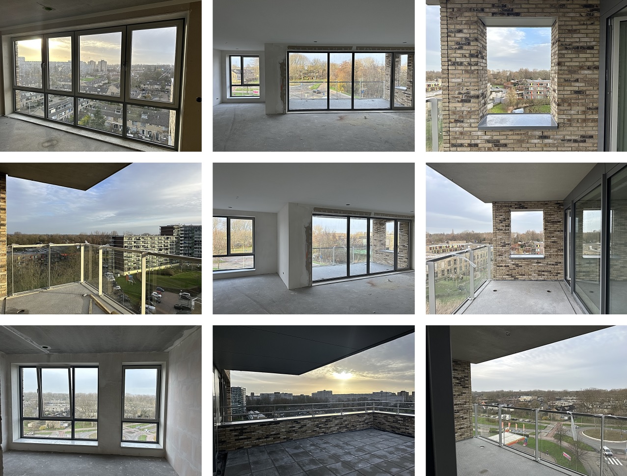 Het appartement is onlangs uit de steigers gekomen. Op dit moment is men o.a. bezig met het behangklaar afwerken van de wanden, het aanbrengen van spuitwerk op de plafonds en het betegelen van de diverse badkamers. Kijk eens wat een uitzicht!